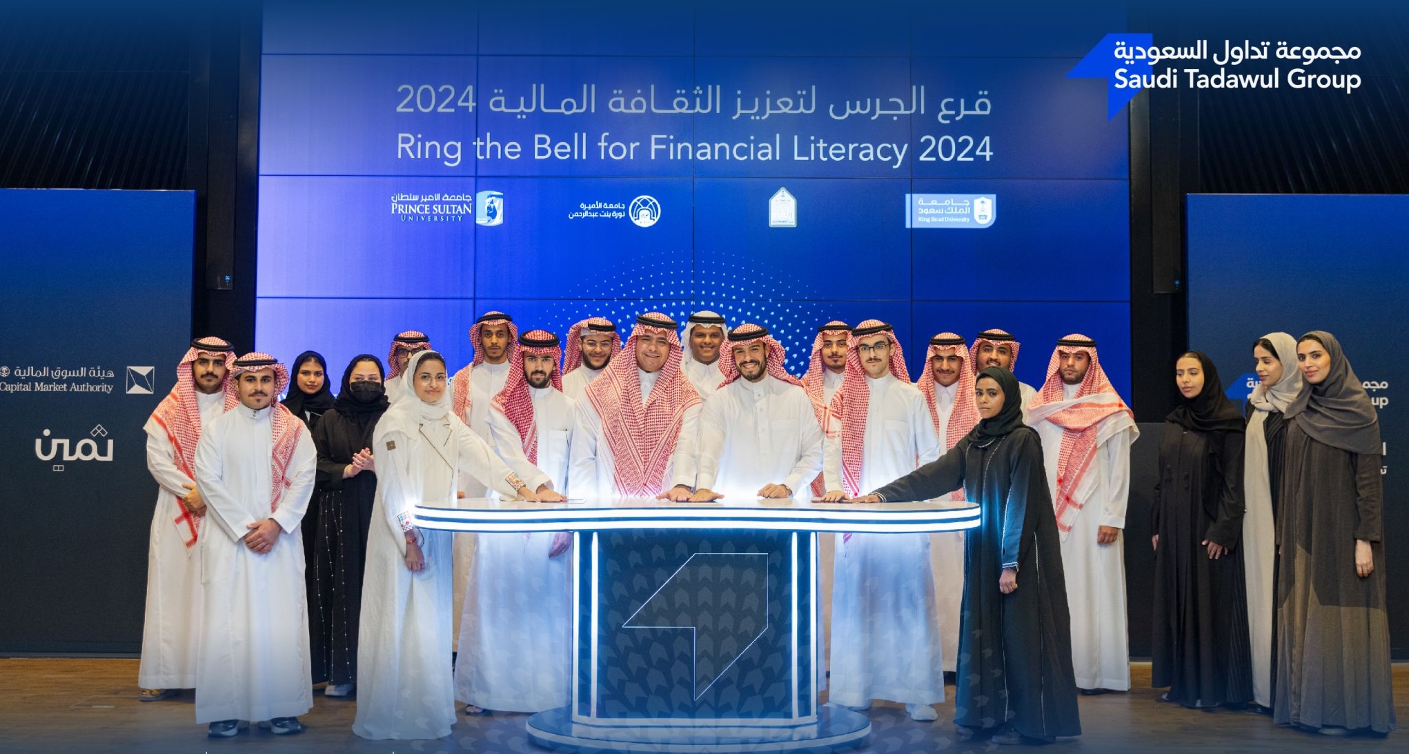A milestone event celebrating the symbolic first listing of a prominent corporation ontheSaudi Stock Exchange, marked by the ringing of the opening bell to fanfare and applause,with distinguished group heads and executives gathered in attendance.